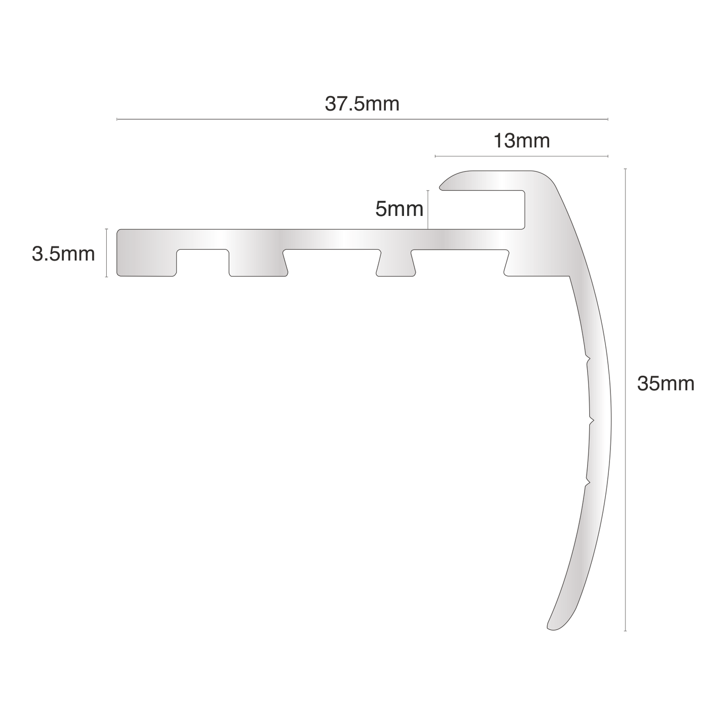 The bullnose design delivers a smooth, rounded edge for enhanced aesthetics and safety, while fitting 5mm thick flooring seamlessly. With a 37.5mm tread and 35mm riser, it ensures a secure grip and lasting stair protection.